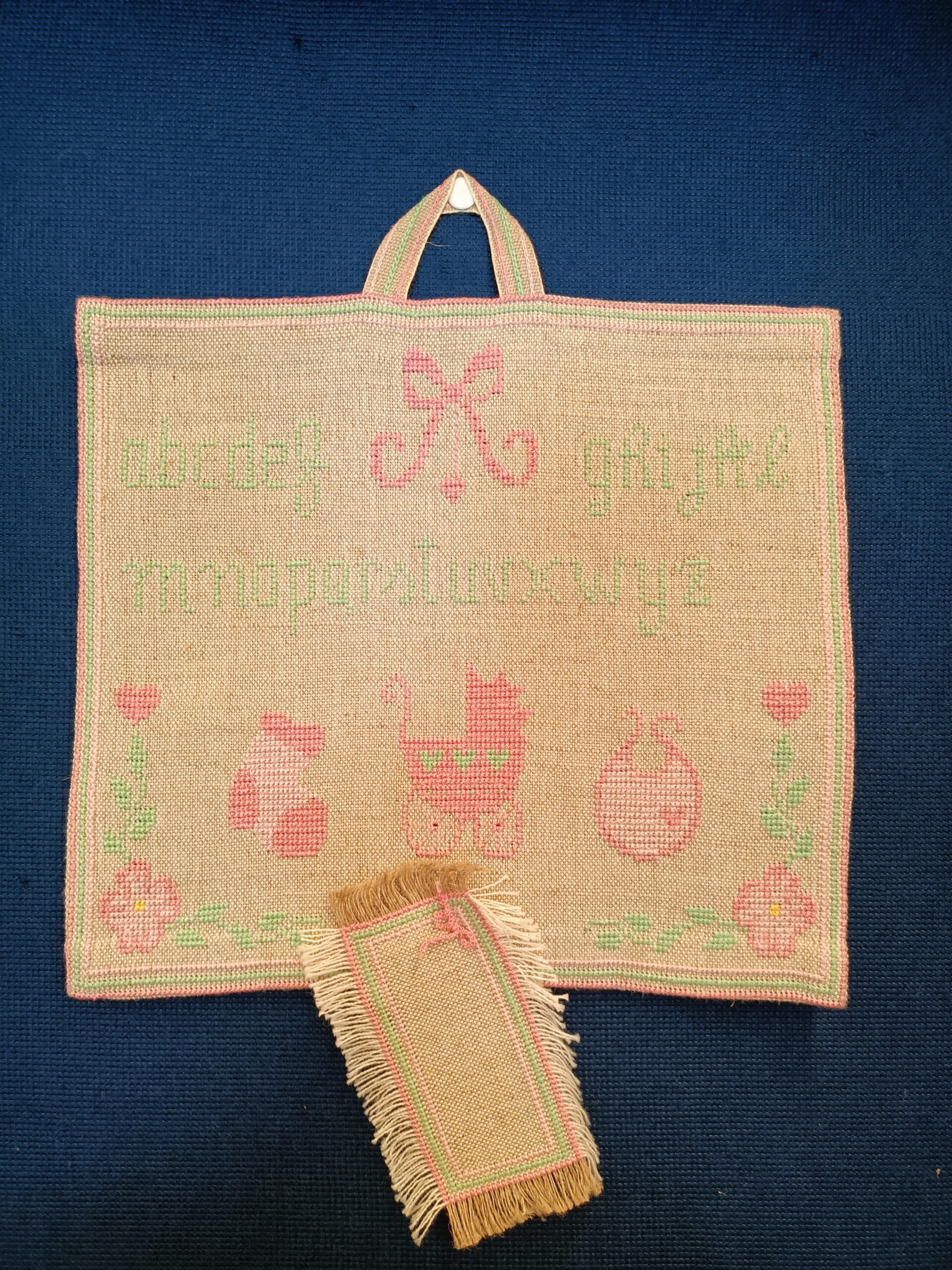 Pannello annuncia nascita bebè in canapa con ricami a punto croce.